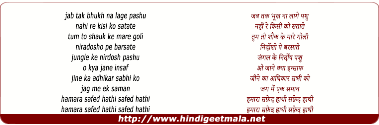 Lyrics of Chhuda Ke Jana Hai Hamaara Safed Hathi - छुड़ा के जाना है हमारा सफ़ेद हाथी jab tak bhukh na lage pashu