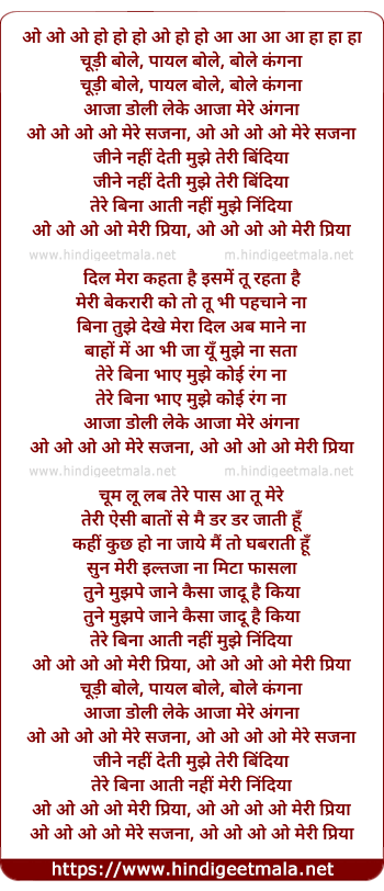 Lyrics of Chudi Bole, Paayal Bole, Bole Kangana - चूड़ी बोले, पायल बोले, बोले कंगना