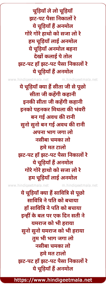 Lyrics of Chudiya Le Lo Chudiya - चूड़ियाँ ले लो चूड़ियाँ