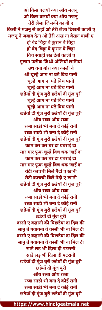 Lyrics of Chullhe Agg Na Ghade Vichch Paani - ओ किस वलयाँ क्या ओय मजनू