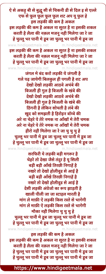 Lyrics of Chullu Bhar Pani Me Doob Jaa - चुल्लू भर पानी मे डूब जा