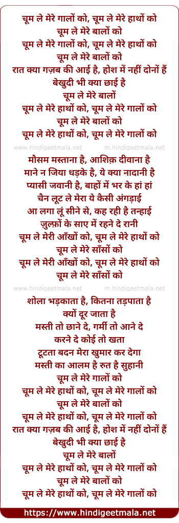 Lyrics of Chum Le Mere Gaalo Ko - चूम ले मेरे गालों को