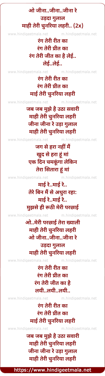 Lyrics of Chunar (Rang Teri Reet Ka) - चुनर (रंग तेरी रीत का)