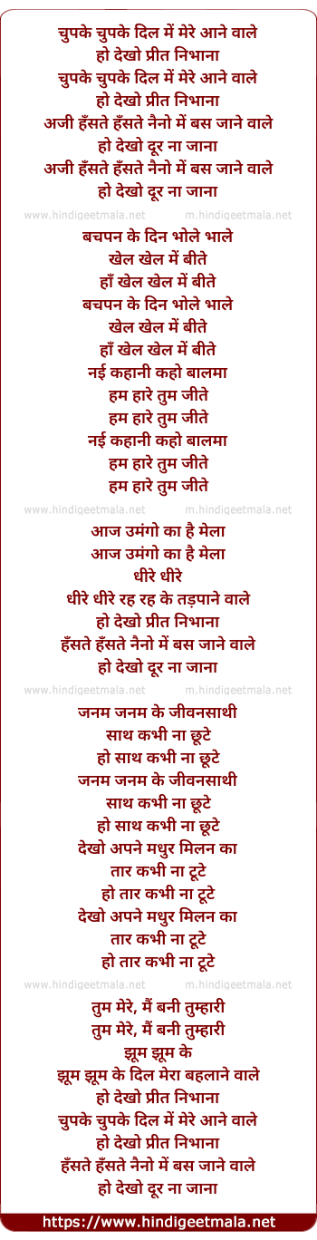 Lyrics of Chupke Chupke Dil Me Aane Wale - चुपके चुपके दिल में मेरे आने वाले