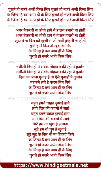 Lyrics of Churate Ho Nazrein Aji Kis Liye - चुराते हो नज़रे अजी किस लिए