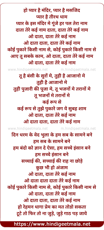 Lyrics of Daata Tere Kai Naam - दाता तेरे कई नाम