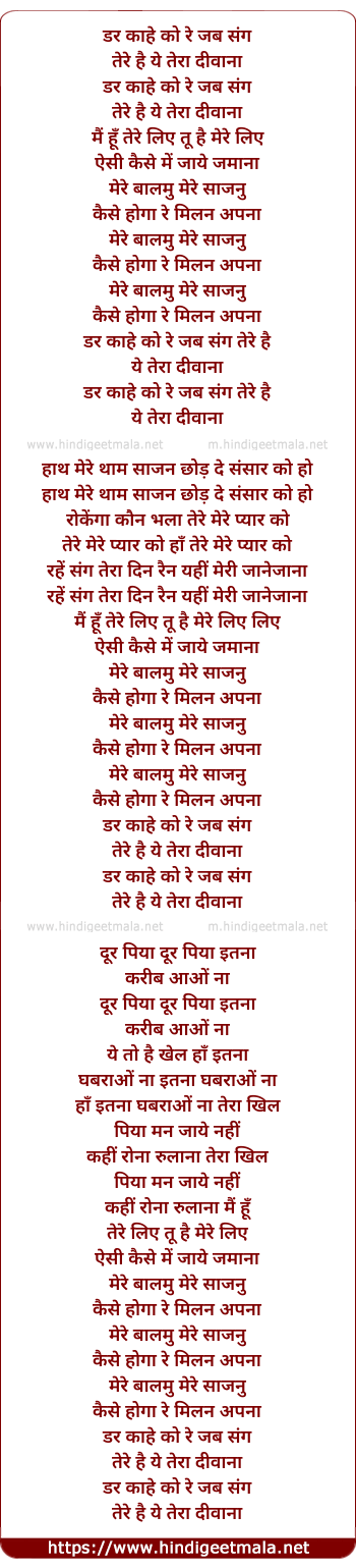 Lyrics of Dar Kahe Ko Re Jab Sang Tere - डर काहे को रे जब संग तेरे