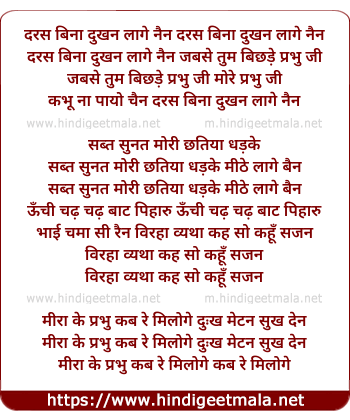 Lyrics of Daras Bin Dukhan Laage - दरस बिना दुखन लागे नैन दरस बिना दुखन लागे नैन
