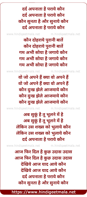 Lyrics of Dard Apnaataa Hai Paraaye Kaun - दर्द अपनाता है पराये कौन