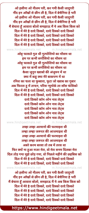 Lyrics of Dard-E-Disco (Remix) - ओ हसीना ओ नीलम परी, कर गयी कैसी जादूगरी