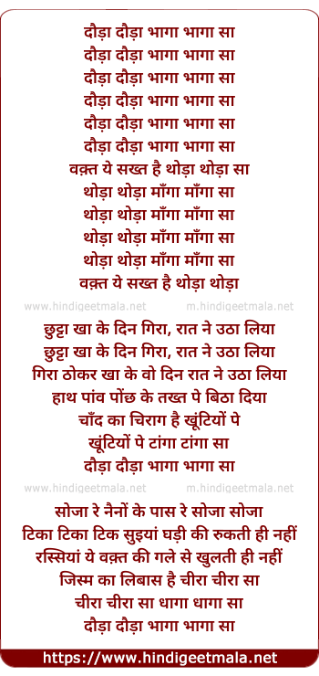 Lyrics of Dauda Dauda Bhaga Bhaga Sa - दौड़ा दौड़ा भागा भागा सा