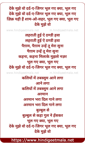 Lyrics of De Ke Mujhe Wah Dard-E-Jigar - देके मुझे वो दर्द-ए-जिगर भूल गए क्या, भूल गए