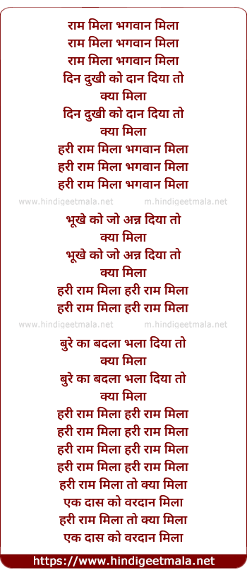 Lyrics of Deen Dukhi Ko Daan Diya - राम मिला भगवान मिला