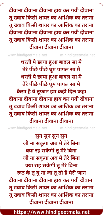 Lyrics of Deewana, Deewana, Deewana Haye Kar Gayi Deewana - दीवाना, दीवाना, दीवाना हाय कर गयी दीवाना
