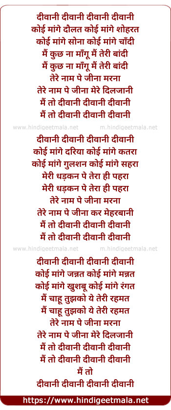 Lyrics of Deewani (Daler Mehndi) - दीवानी दीवानी दीवानी दीवानी
