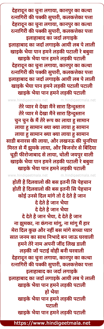 Lyrics of Dehradhu Ka Chuna Lagaya, Kanpur Ka Khatta - देहरादून का चुना लगाया, कानपुर का कत्था