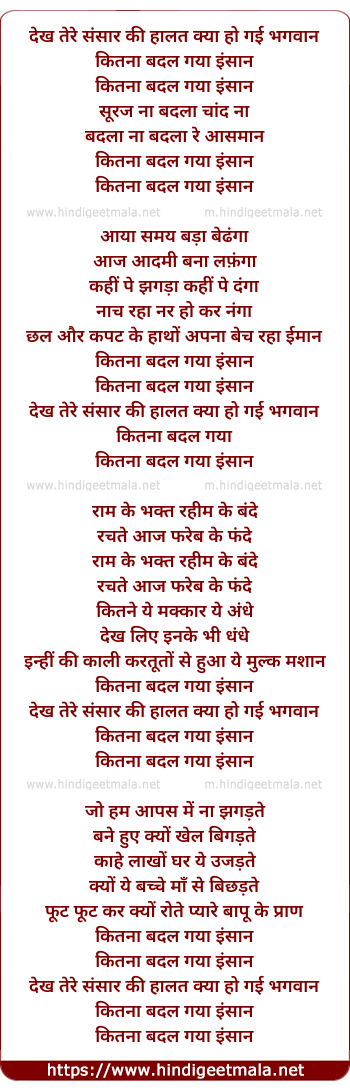 Lyrics of Dekh Tere Sansaar Ki Haalat Kyaa Ho Gai Bhagavaan - देख तेरे संसार की हालत, क्या हो गई भगवान