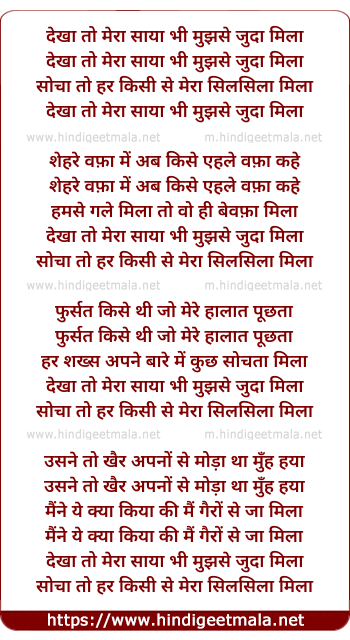 Lyrics of Dekha To Mera Saya Bhi - देखा तो मेरा साया भी मुझसे जुदा मिला