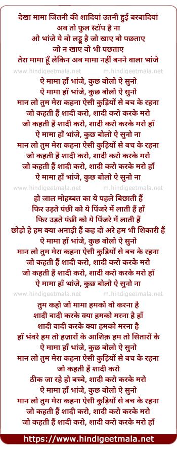 Lyrics of Dekha Mama Jitani Ki Shadiya Utni Huyi Barbadiya - देखा मामा जितनी की शादियां उतनी हुई बरबादियां