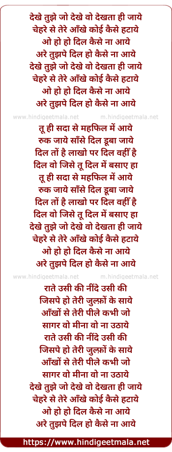 Lyrics of Dekhe Tujhe Jo Dekhe Wo Dekhta Hi Jaaye - देखे तुझे जो देखे वो देखता ही जाये