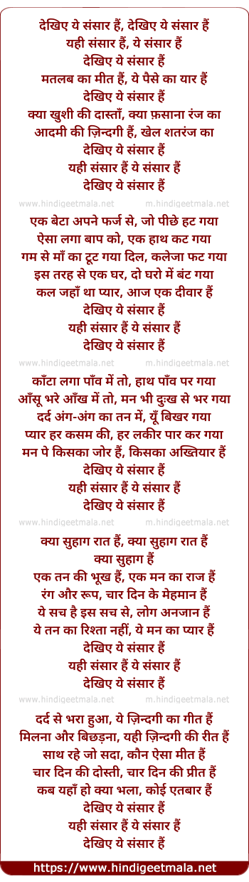 Lyrics of Dekhiye Ye Sansar Hai - देखिए ये संसार हैं