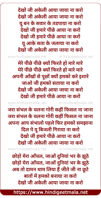 Lyrics of Dekho Ji Akeli Aaya Jaaya Na Karo - देखो जी अकेली आया जाया ना करो