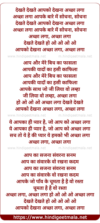 Lyrics of Dekhte Dekhte Aapko Dekhna Achcha Laga - देखते देखते आपको देखना अच्छा लगा