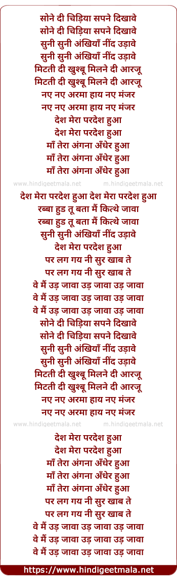 Lyrics of Des Mera Pardes Hua - सोने दी चिड़िया सपने दिखावे