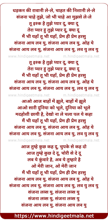 Lyrics of Dhadakan Ki Ravaani Le Le, Sanjana I Love You - धड़कन की रावानी ले ले, संजना आई लव यु