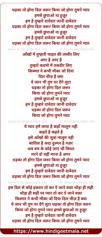 Lyrics of Dhadka To Hoga Dil Zarur Kiya Jo Hoga Tumne Pyar - धड़का तो होगा दिल जरूर किया जो होगा तुमने प्यार