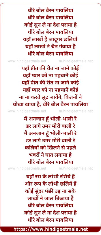 Lyrics of Dheere Bol Bairan Payaliya - धीरे बोल बैरन पायलिया