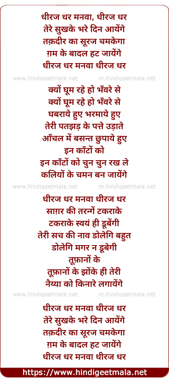 Lyrics of Dhiraj Dhar Manva Tere Sukh Ke Bhare Din Aayenge - धीरज धर मनवा तेरे सुखके भरे दिन आयेंगे