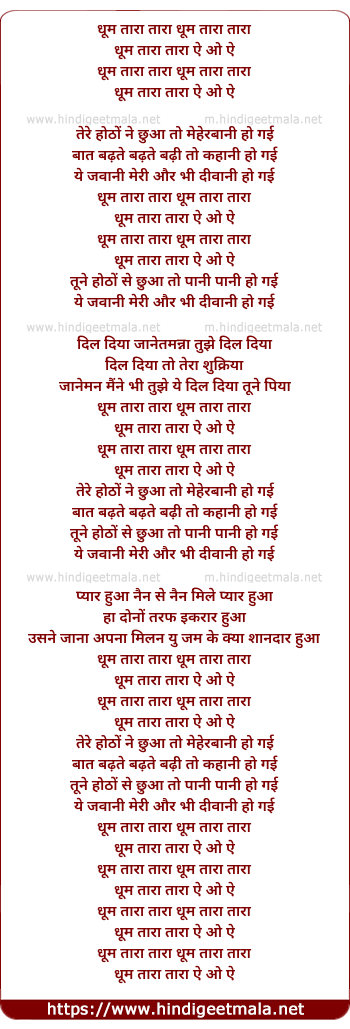 Lyrics of Dhoom Tara Tara Dhoom Tara Tara - धूम तारा तारा धूम तारा तारा