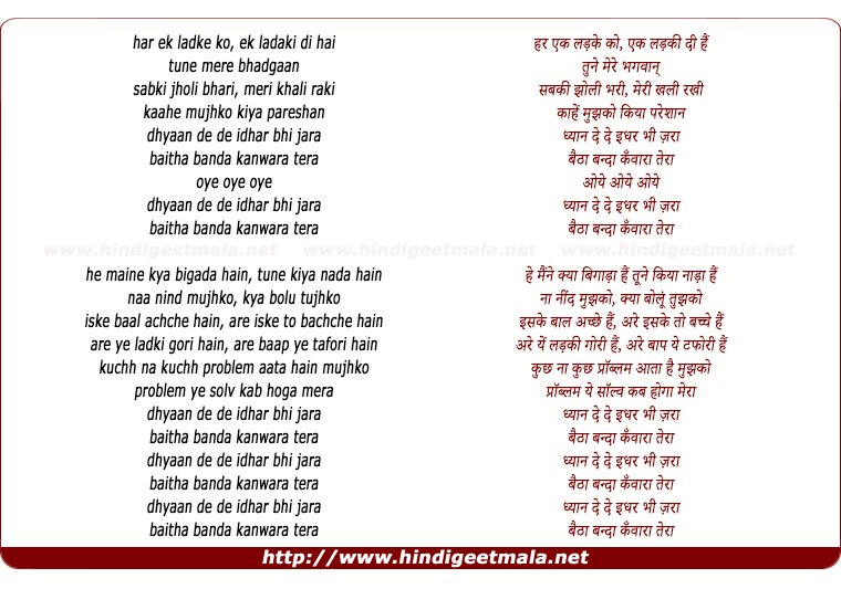 Lyrics of Dhyaan De De Idhar Bhi Zara - हर एक लड़के को, एक लड़की दी हैं