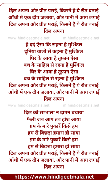 Lyrics of Dil Apna Aur Prit Parayi, Kisne Hain Ye Rit Banayi - दिल अपना और प्रीत पराई, किसने है ये रीत बनाई