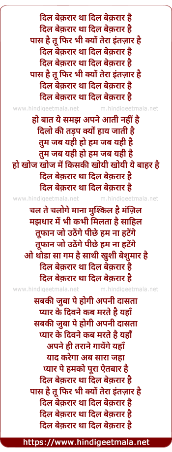 Lyrics of Dil Bekaraar Tha Dil Bekaraar Hai - दिल बेक़रार था दिल बेक़रार है