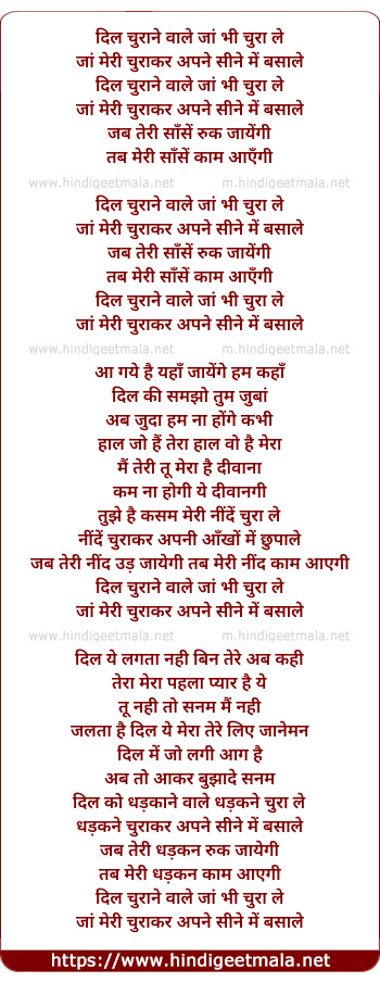 Lyrics of Dil Churane Wale Jaan Bhi Churale - दिल चुराने वाले जां भी चुरा ले