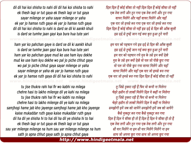 Lyrics of Dil Dil Hai Koi Shisha To Nahi - दिल दिल हैं कोई शीशा तो नहीं