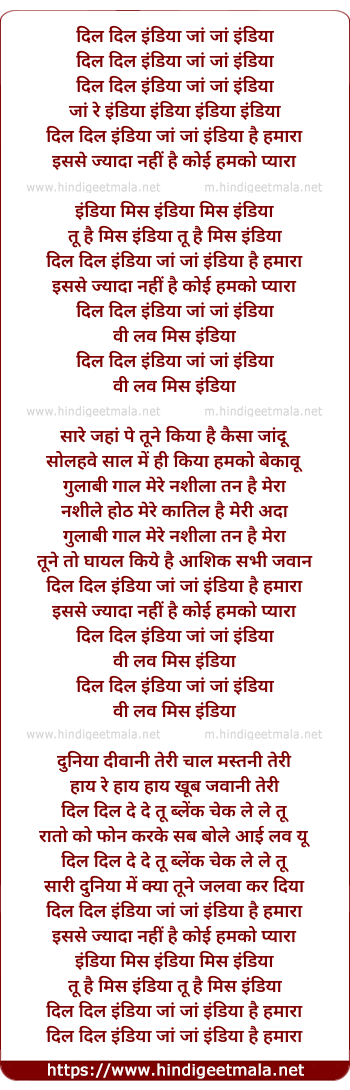 Lyrics of Dil Dil India Jaan Jaan India - दिल दिल इंडिया जां जां इंडिया