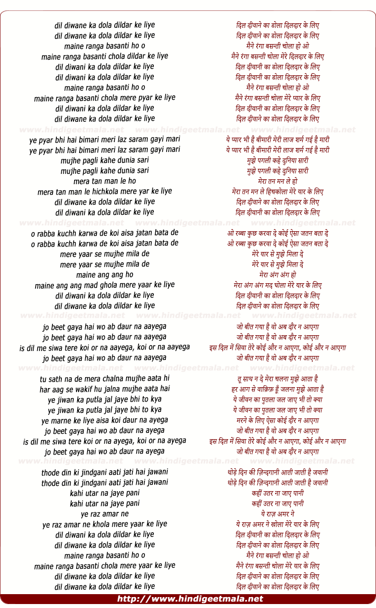 Comments for lyrics of song "Dil Divaane Kaa Dola Dildaar Ke Liye"