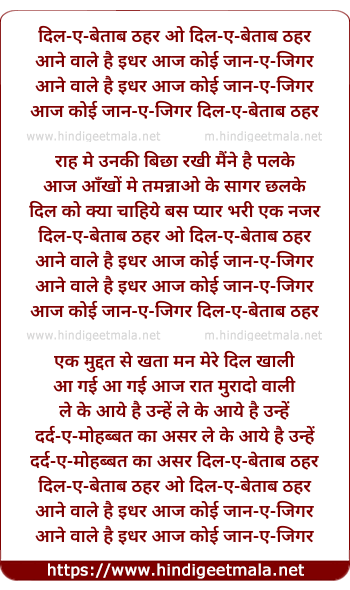 Lyrics of Dil-E-Betaab Thahar O Dil-E-Betaab Thahar - दिल-ए-बेताब ठहर ओ दिल-ए-बेताब ठहर