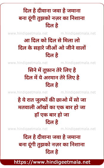 Lyrics of Dil Hai Deewana Jawaa Hai Zamana - दिल है दीवाना जवा है जमाना
