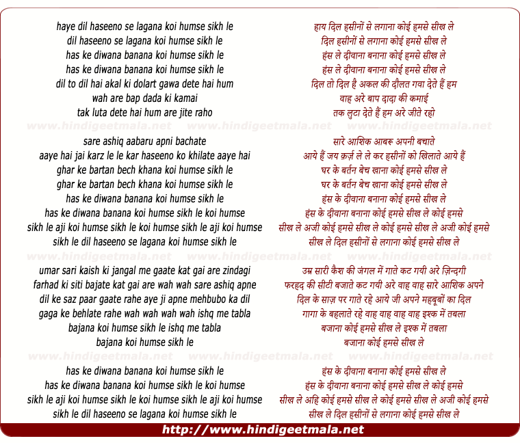 Lyrics of Dil Hasino Se Lagana Koi Humse Sikh Le - दिल हसीनों से लगाना कोई हमसे सीख ले