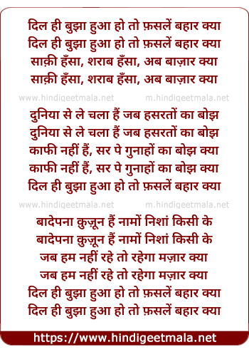 Lyrics of Dil Hi Bujhaa Huaa Ho To Fasl-E-Bahaar Kyaa - दिल ही बुझा हुआ हो तो फ़सलें बहार क्या