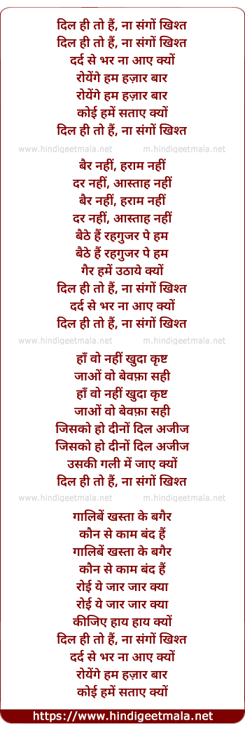 Lyrics of Dil Hi To Hai Na Sango Khisht (Female) - दिल ही तो हैं, ना संगों खिश्त