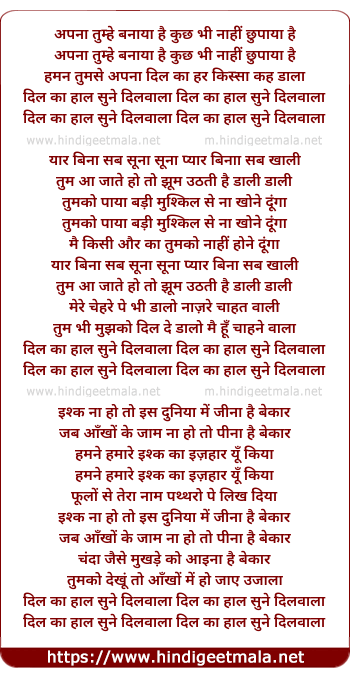 Lyrics of Dil Ka Haal Sune Dilwaala - अपना तुम्हे बनाया है कुछ भी नाहीं छुपाया है