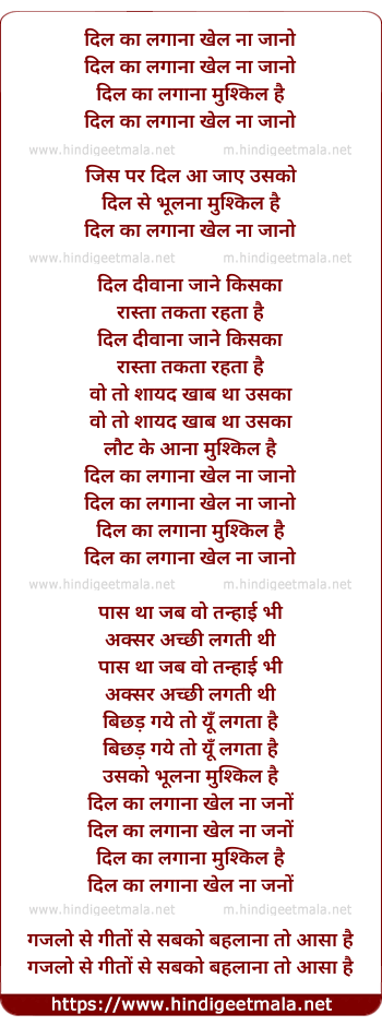 Lyrics of Dil Ka Lagana Khel Na Jano - दिल का लगाना खेल ना जानो