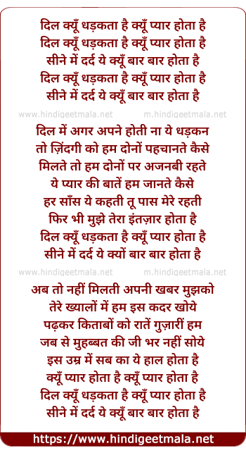 Lyrics of Dil Kyu Dhadakta Hai Kyu Pyar Hota Hai - दिल क्यूँ धड़कता है क्यों प्यार होता है