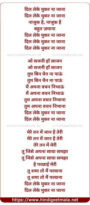 Lyrics of Dil Le Ke Mukar Na Jana - दिल ले के मुकर ना जाना