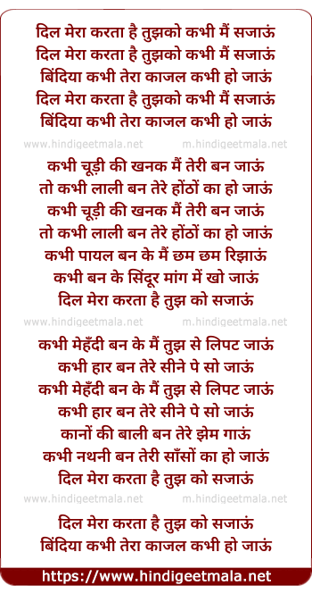 Lyrics of Dil Mera Karta Hai - दिल मेरा करता है तुझको कभी मैं सजाऊं